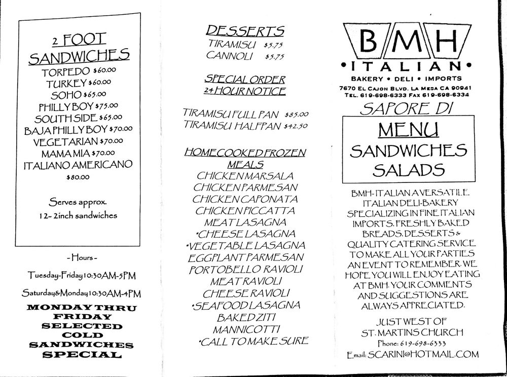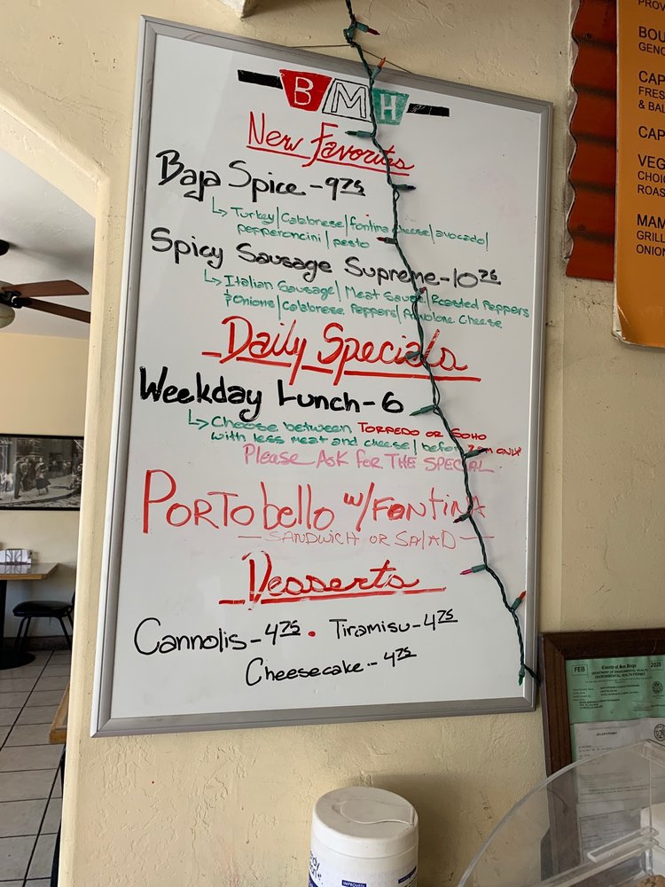Introducing the menu at BMH Italian, a hidden gem in La Mesa, CA that offers a variety of delicious Italian sandwiches. From classic favorites like Mama Mia with grilled eggplant and goat cheese to unique options like Baja Philly Boy with avocado and turkey, there is something for everyone here. The reviews rave about the generous portion sizes and fresh ingredients, with customers praising the friendly staff and cozy atmosphere. Don't miss out on the delectable salads like the Antipasto Salad and the mouth-watering hot sandwiches like the Sweet Italian Sausage. BMH Italian is not just a sandwich shop; it is an experience worth savoring. Visit today and indulge in a taste of Italy right in your neighborhood.